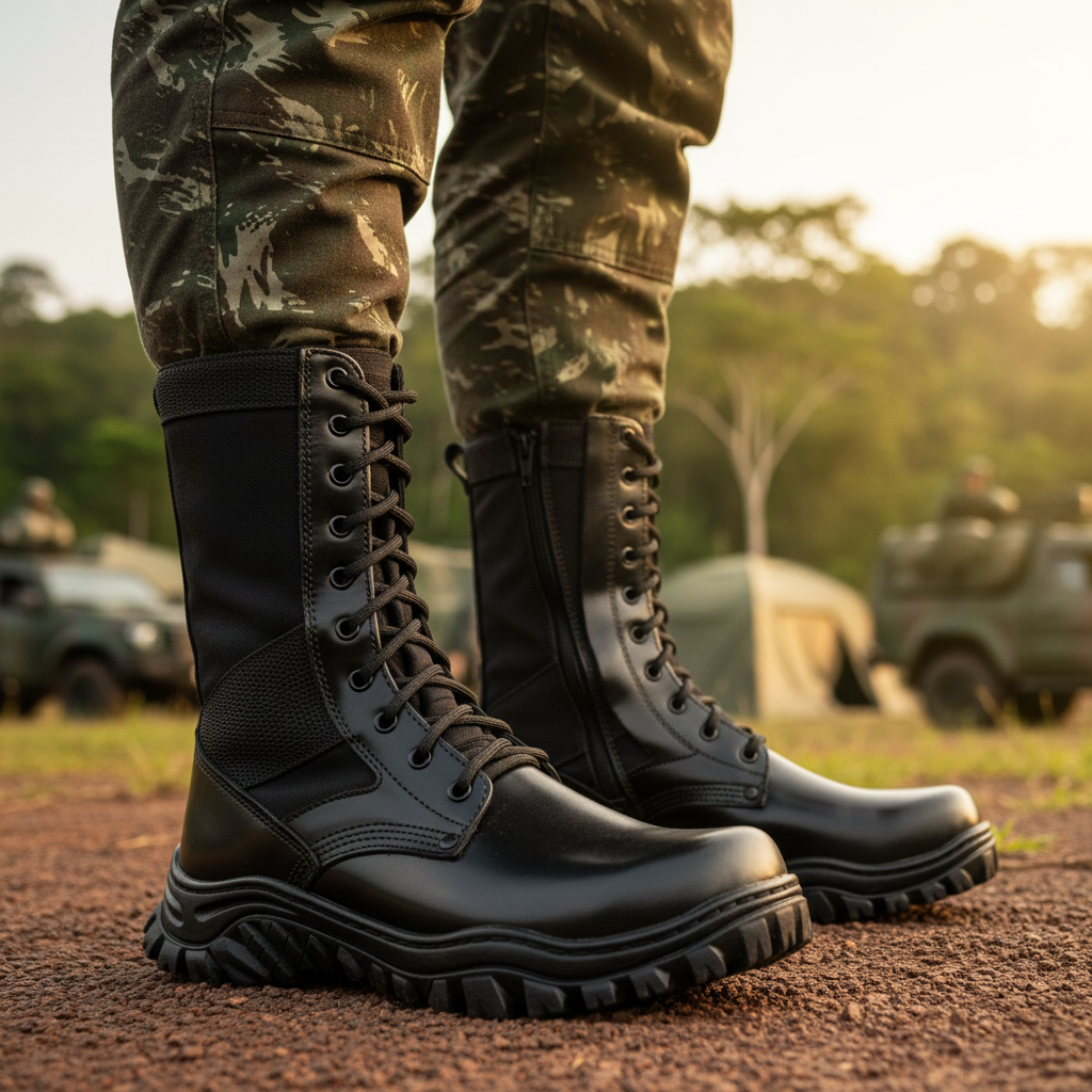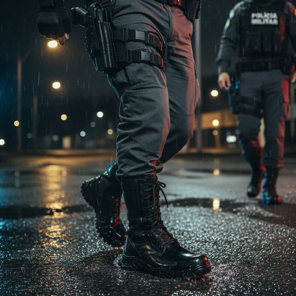 4O ELITE PRETO BOX ZIPER um coturno de alto desempenho e resistência, desenvolvido especialmente para profissionais que exigem durabilidade, conforto e aderência superior. Confeccionado em couro legítimo de alto brilho na cor preta, alia robustez e sofisticação. Seu cano em lona de algodão proporciona flexibilidade e ventilação, enquanto o zíper lateral garante praticidade no calce.